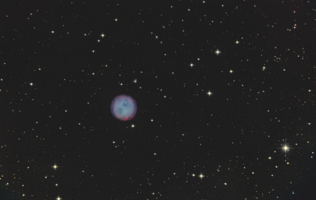 Der planetarische Nebel ist ca. 1360 Lichtjahre weit weg und hat einen Durchmesser von 1,4 Lichtjahren. 30 Aufnahmen a 180 Sek. 19 Aufnahmen a 300 Sek. Sony A7 S-a am Skywatcher 120/840 Esprit ISO 3200 Optolong LÈtxreme Filter