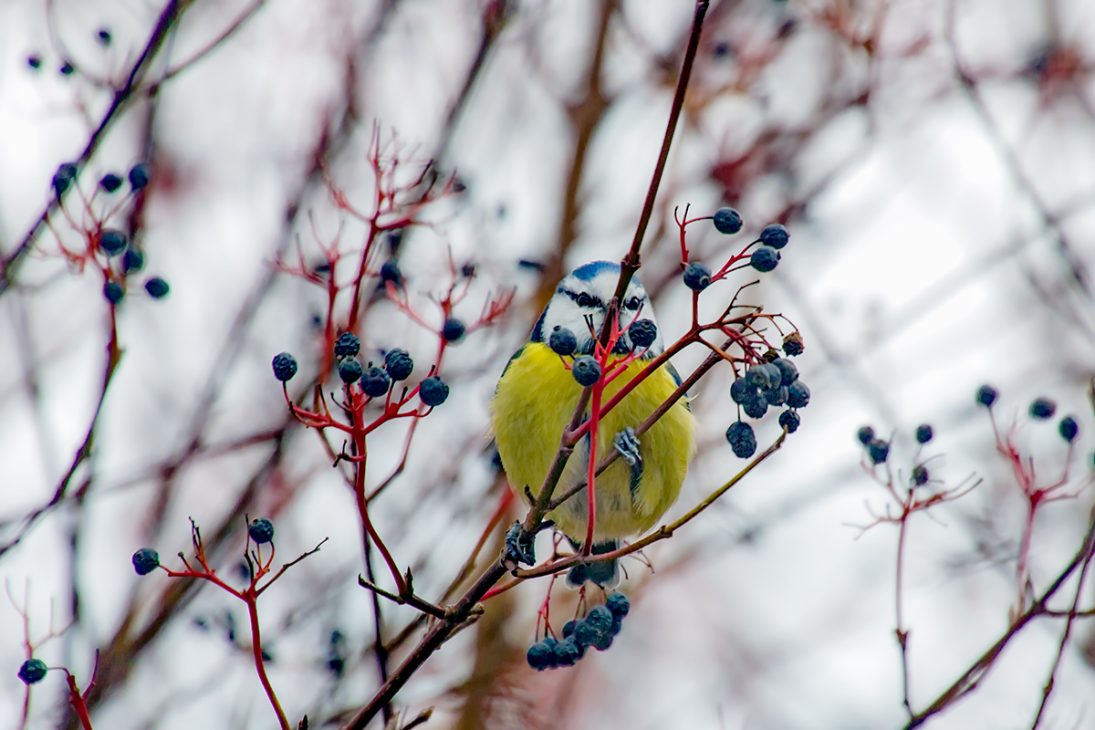 Nach einer weiteren Stunde in der Saukälte hat sich wenigstens ein Meise auf dem Busch niedergelassen.