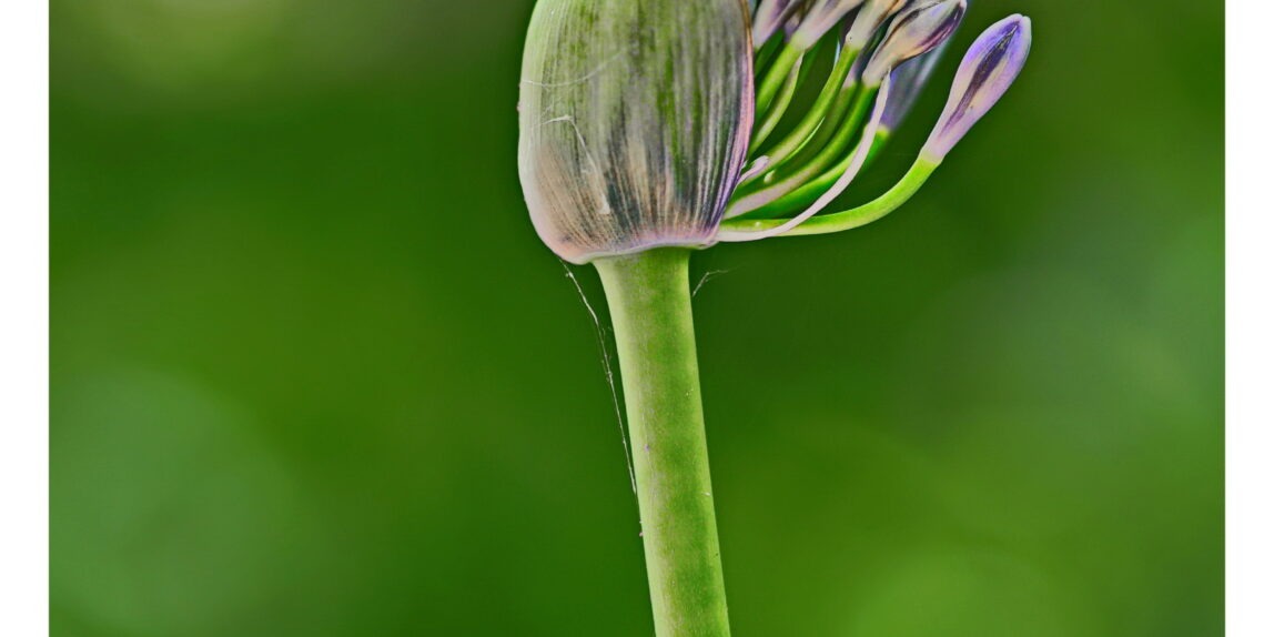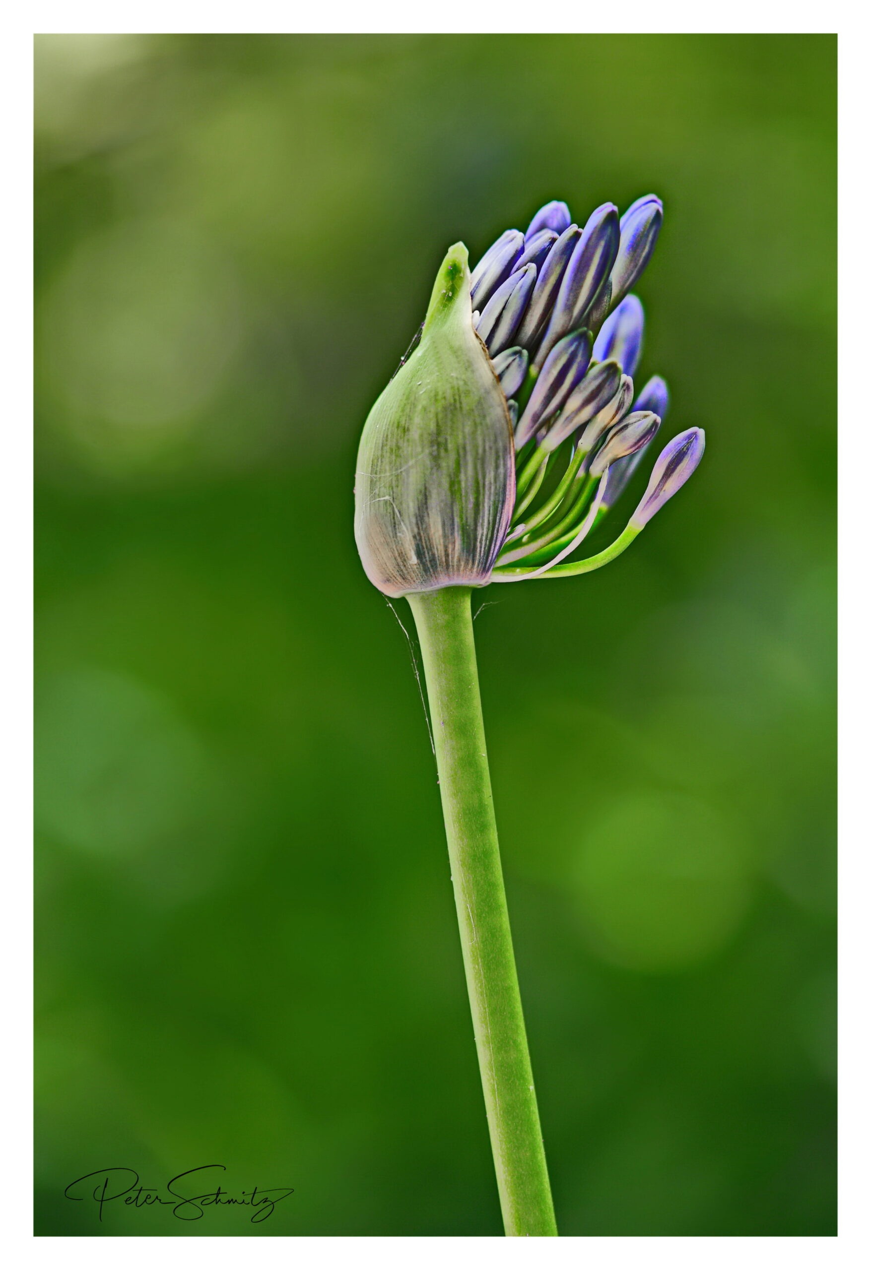 Die schützende Hülle öffnet sich gerade und gibt die violett-blauen Blüten frei.