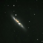 Messier 82 (auch als NGC 3034, M82 bezeichnet) ist eine Spiralgalerie. Sie ist etwa 12 Millionen Lichtjahre entfernt. In ihrer Nähe befindet sich die helle Spiralgalaxie M81. Durch die Wechselwirkung mit M81 bei einem nahen Vorbeiflug vor etwa 500 Millionen Jahren ist die Galaxie M82 dramatisch verändert worden.