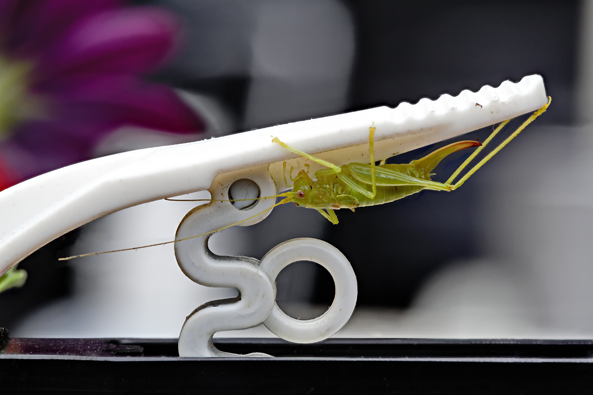 Eine südliche Eichenschrecke ließ sich auf, oder besser gesagt, unter meiner Pflanzenklammer nieder.