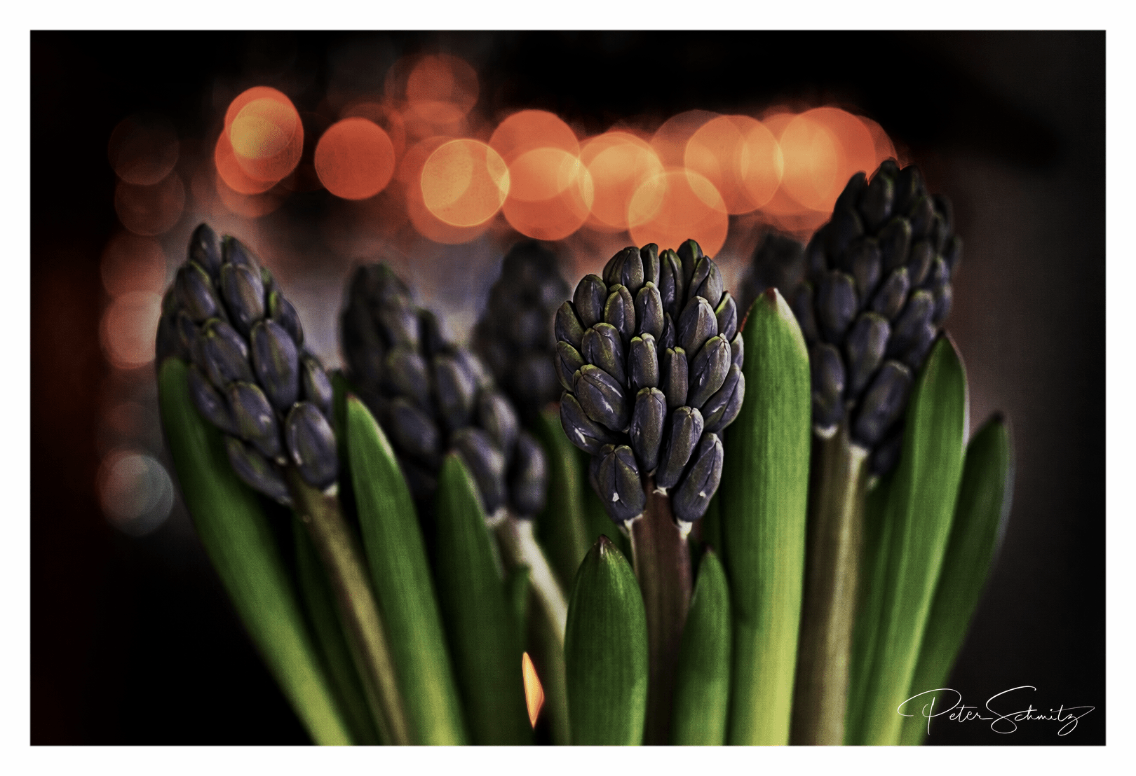 VonschmitzpixelHyazinthe Kurz vor dem Aufblühen zeigt sich die Hyazinthe in konzentrierter Ruhe. Die dicht geschlossenen, violetten Knospen stehen in starkem Kontrast zu den satten grünen Blättern. Der dunkle Hintergrund mit warmem Bokeh verleiht dem Bild Tiefe und eine stille, fast meditative Atmosphäre. Das Makro hebt die feinen Strukturen hervor und fängt den Moment ein, in…