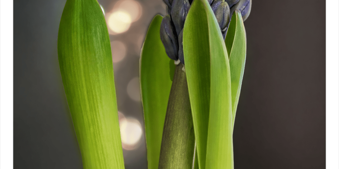Kurz vor dem Aufblühen zeigt sich die Hyazinthe in konzentrierter Ruhe. Die dicht geschlossenen, violetten Knospen stehen in starkem Kontrast zu den satten grünen Blättern. Der dunkle Hintergrund mit warmem Bokeh verleiht dem Bild Tiefe und eine stille, fast meditative Atmosphäre.