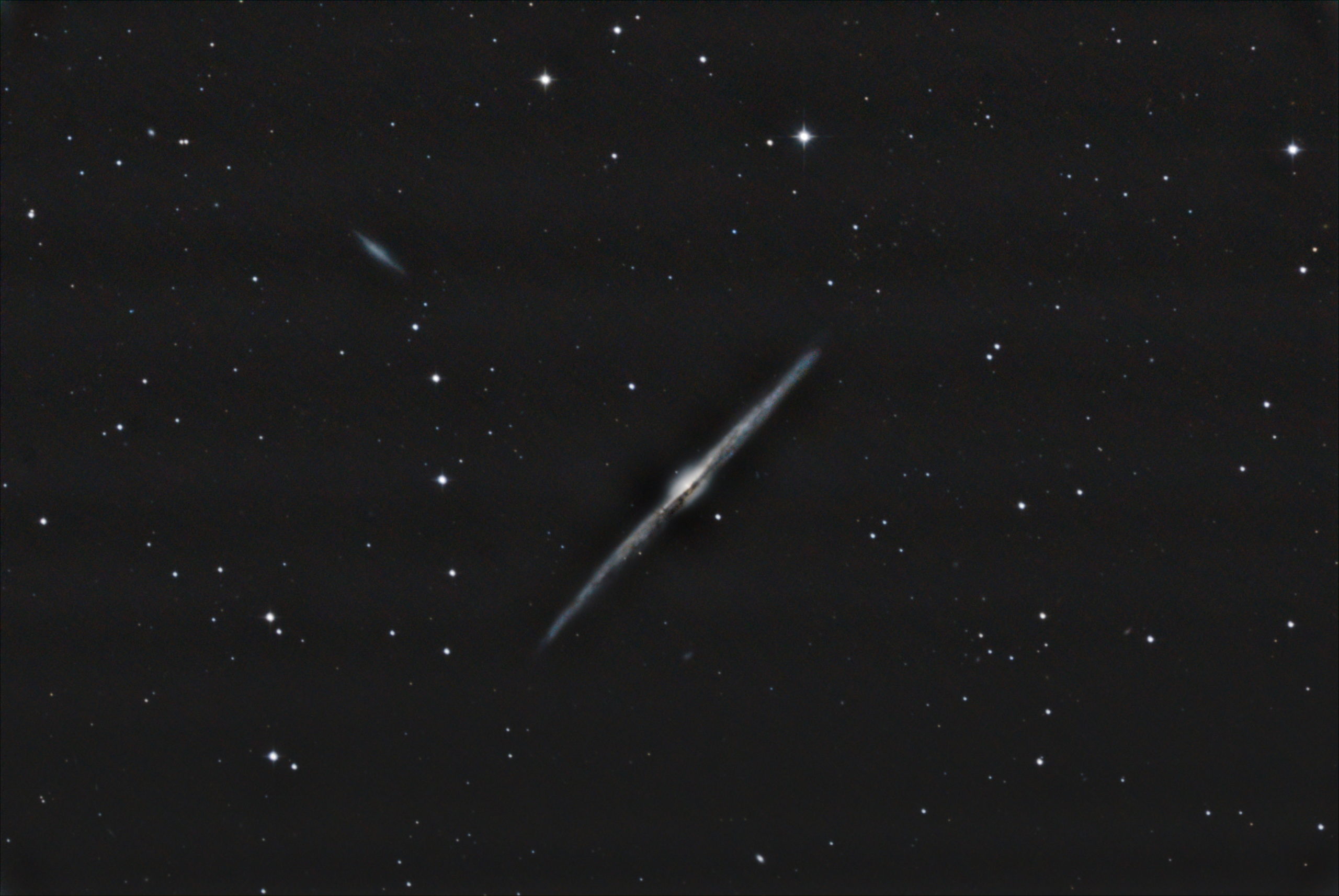 Die Spindelgalaxie von gestern und vorgestern. An den Rändern lässt sich jetzt eine leichte „Biegung“ (»warp«) erkennen, die durch die Rotation der Scheibe entsteht.