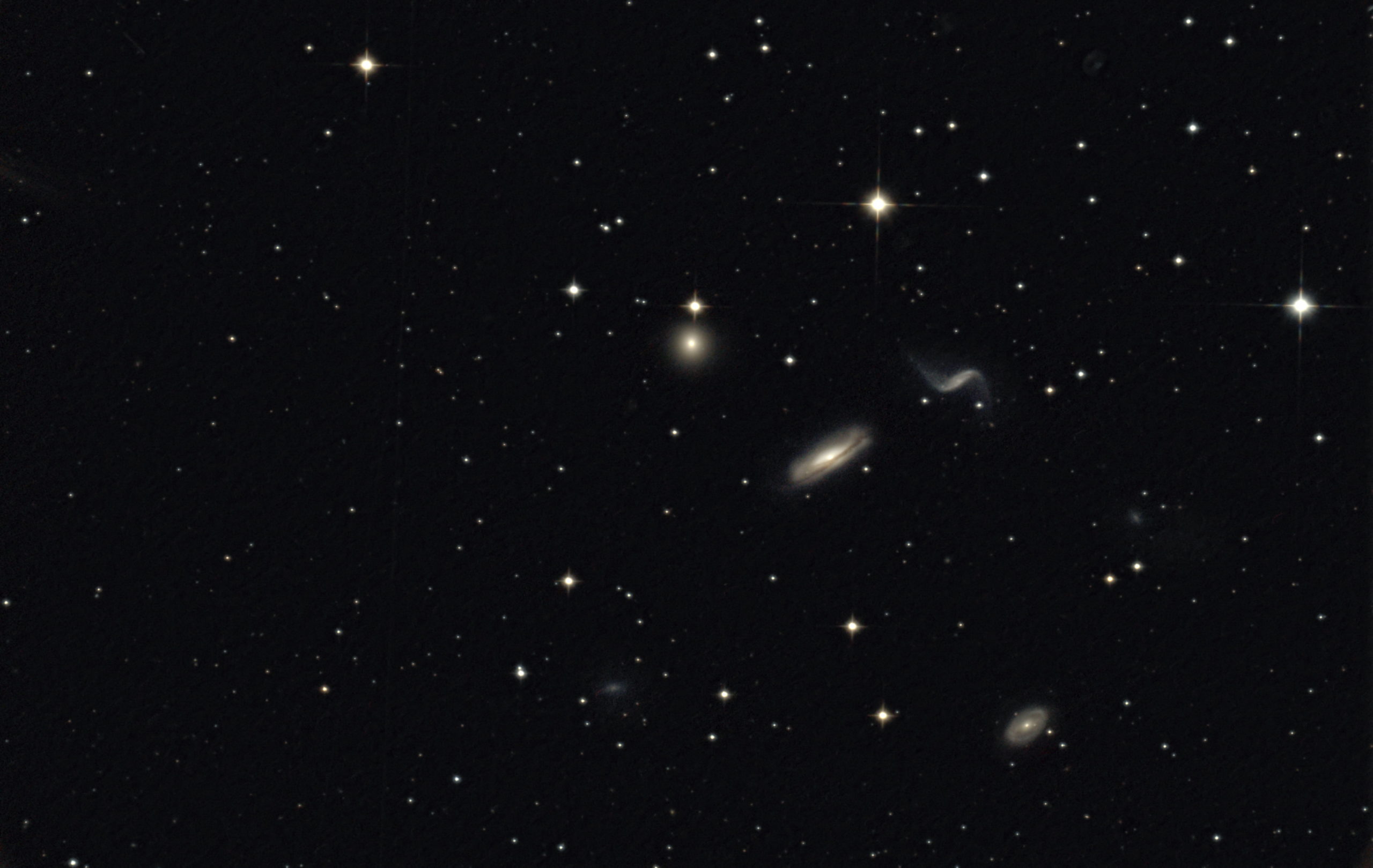 Die 4 Galaxien sind in gravitativer Wechselwirkung untereinander. Das erkennt man auch an den verbogenen Spiralarmen.